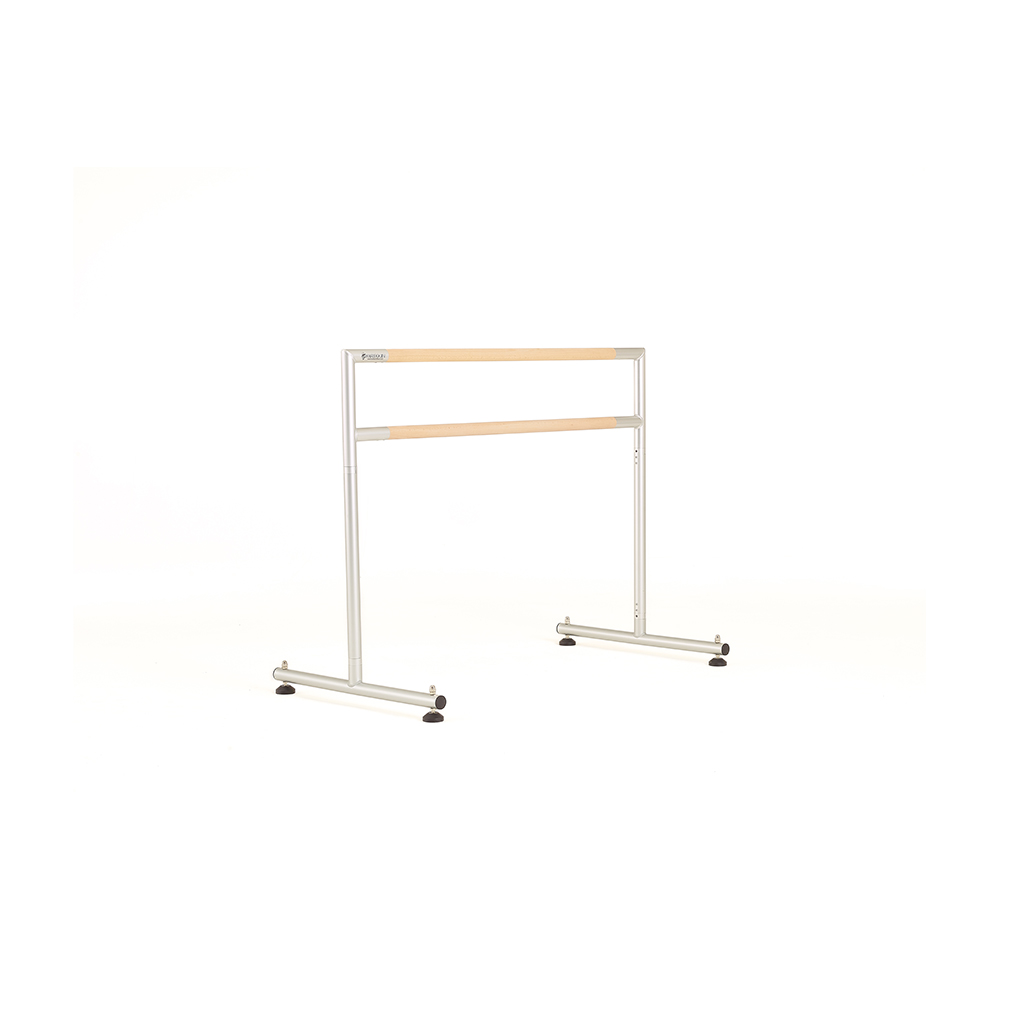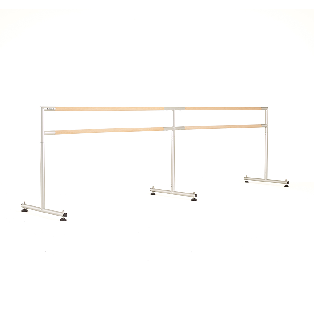 Harlequin’s studio quality freestanding portable ballet barre is constructed from anodised aluminium with a smooth silver finish. Available with a solid beech barre, they are lightweight yet very stable.