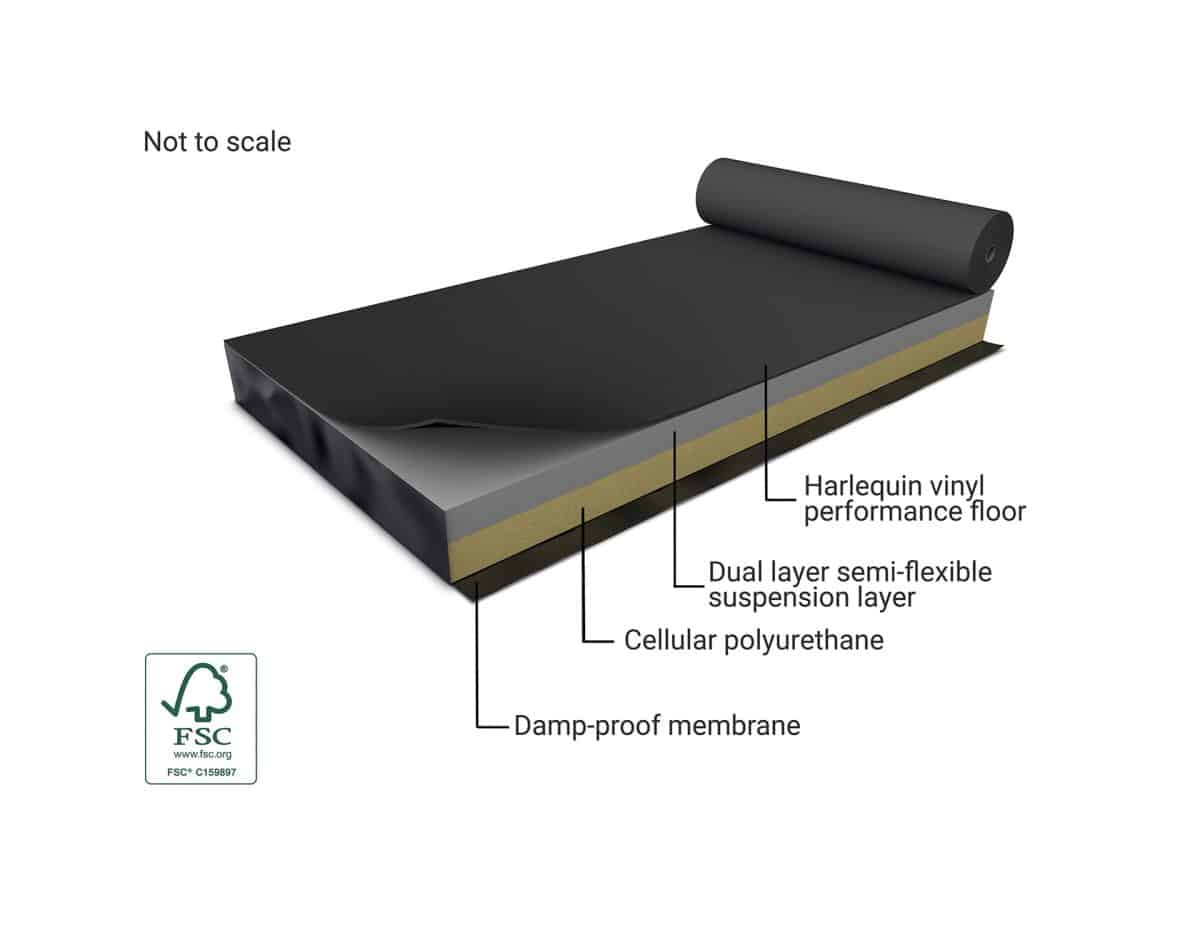 Harlequin Activity is a ‘fully-floating’ sprung floor system without fixings to the sub-floor constructed using Harlequin’s proprietary ‘triple sandwich’ construction method, created over 30 years ago.